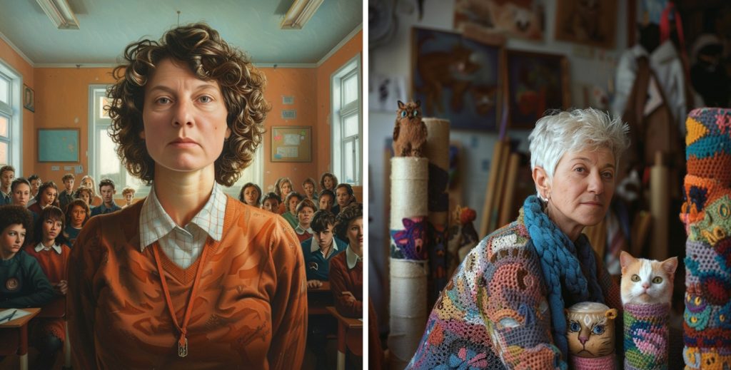 Wie ich einem → Foto in der Schwäbischen entnehme, ähneln die Skulpturen von Prinz bestrickten Kratzbäumen, wie gelangweilte Hauskatzen sie lieben. Das ist originell und inspirierte den SPHÄRMAN zur Erstellung eines KI-Bildes, das man oben sieht. Ingrid Kraft-Bounin (links daneben) habe ich als strenge Mediengouvernante in ein Klassenzimmer gestellt.