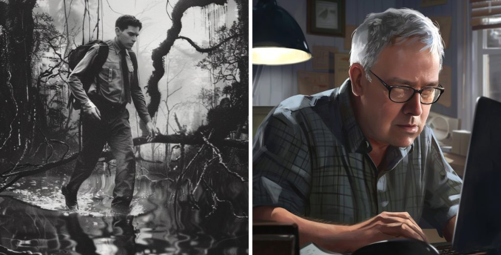 Du siehst oben zwei KI-Bilder. Das eine zeigt den legendären „rasenden Reporter“ Egon Erwin Kisch (1885-1948) in einem Sumpfgebiet, vermutlich auf der Suche nach Beweisen für eine heiße Story. Das andere KI-Bild zeigt einen Mann, der in gekrümmter Haltung vor seinem Bürocomputer sitzt. Er sieht ein bisschen aus, wie Andreas Müller, ein Reporter der „Stuttgarter Zeitung“.